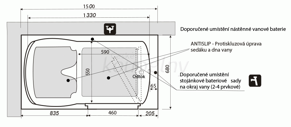 Dno vany ODA 150 E má protiskluzovou úpravu, rovněž tak pohodlný integrovaný sedák s ergonomickým tvarováním, který zajišťuje bezpečnou polohu uživatele při sedací koupeli.